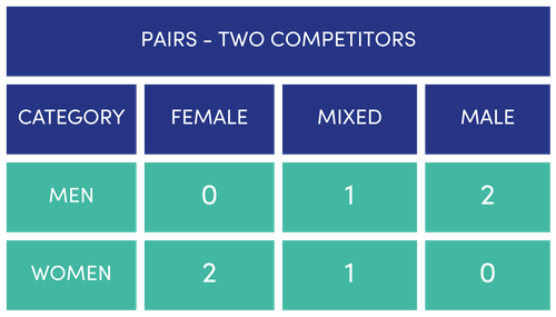 Within each format, there are multiple categories competing for the podium, depending on the specific make-up of your team. Use this handy chart to better understand how this works.
